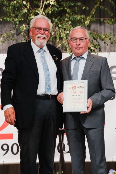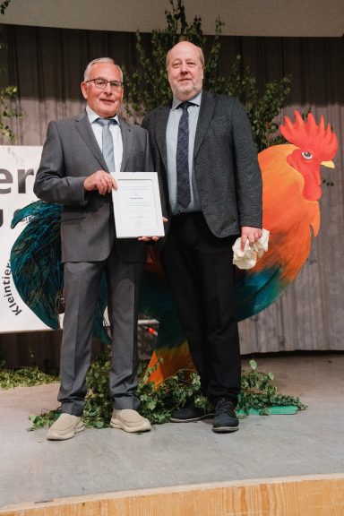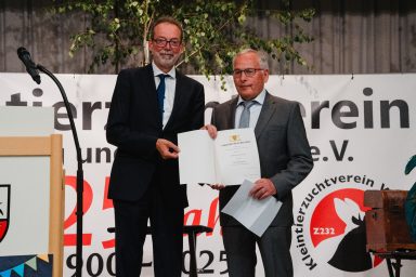 Für seine überragenden züchterischen Leistungen ernannte Landesverband Vorsitzender Ulrich Hartmann Joachim Kern zum Meister der schwäbischen Rassekaninchenzucht. Die goldene Ehrennadel des Landesverbands der Rassegeflügelzüchter erhielt er von Hansjörg Opala angesteckt.